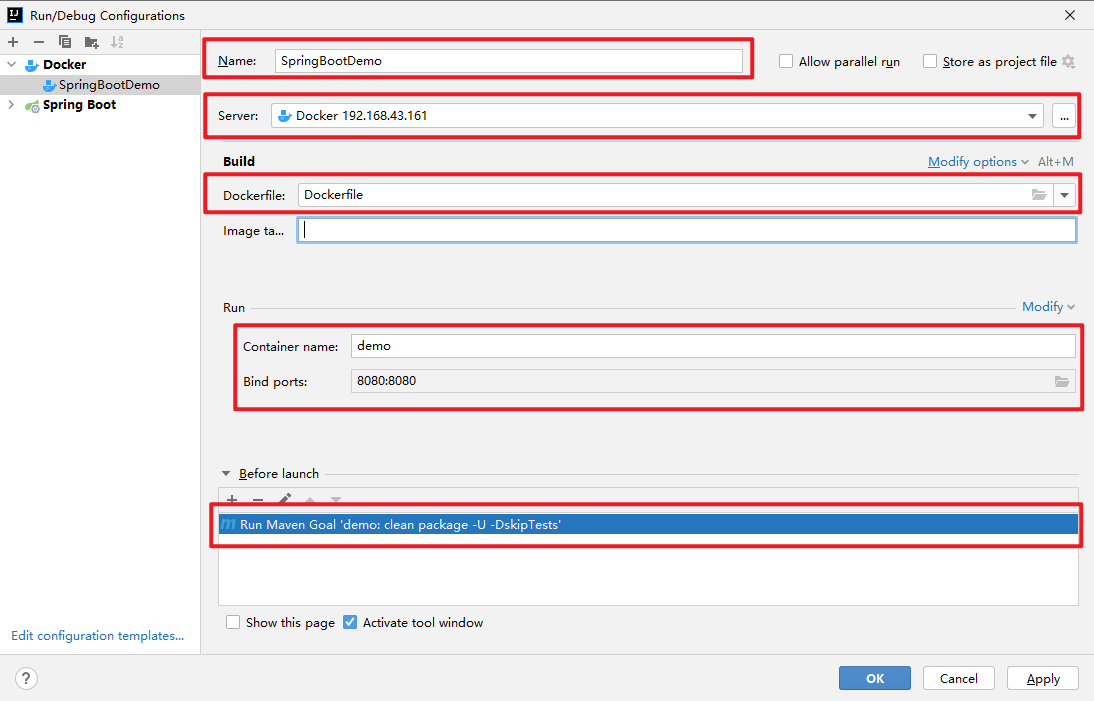 Before launch选择Maven 并输入命令:clean package -U -DskipTests,这个命令在每次编译 Dockerfile 之前都会运行